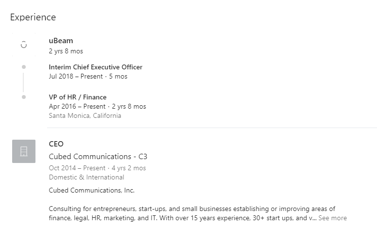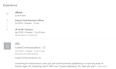 The "begun a search for a new CEO" line is interesting, as normally that line is "and introducing our new CEO" or "long serving COO steps into this role" or similar. Problem is that uBeam has bled senior executives - by my count it's 1 CEO, 1 CFO, 2 CTOs, 2 COOs, and 3 VP Engineering that have departed, and that doesn't include the other staff. The COO who left most recently (according to LinkedIn), around May 2018 after barely 9 months on the job, had an extensive background in IP licensing and would have been perfect for a role to transition to "b2b licensing for IoT". To me, there's a red flag here, if this were well planned out and in a well running company, I'd expect to see a smooth handover to an experienced executive happy to take on the role, and you don't hand it over to the head of HR, no matter how talented they are, they're not the right choice for a tech company looking to do licensing deals.